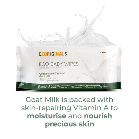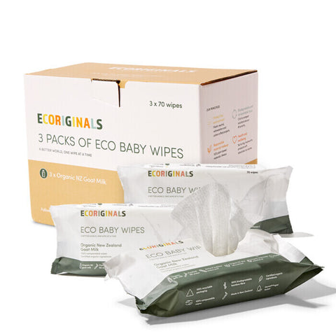 Ecoriginals 3 packs of 70 soft luxury natural Eco Baby Wipes made in New Zealand with Goats Milk. 100% natural, biodegradable wipes made with only a handful of pure ingredients carefully selected to offer a gentle clean and promote healthy skin for babies and children.