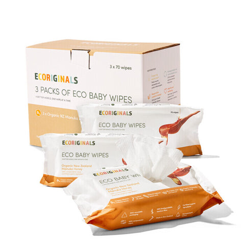 Ecoriginals 3 packs of 70 soft luxury natural Eco Baby Wipes made in New Zealand with manuka honey. 100% natural, biodegradable wipes made with only a handful of pure ingredients carefully selected to offer a gentle clean and promote healthy skin for babies and children.