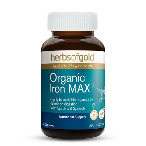 Organic Iron MAX contains Iron, Folic Acid and Vitamins B2 and B12 to maintain haemoglobin formation and assist healthy red blood cell production to support blood health. Iron and Vitamin B12 support the transport of oxygen in the body and help oxygen transport to body tissues. Organic Iron MAX supports energy production and nervous system health and aids the synthesis of neurotransmitters. It is formulated with Vitamin C, to support the absorption of dietary Iron, and Spirulina, a blue-green Algae rich in Iron.