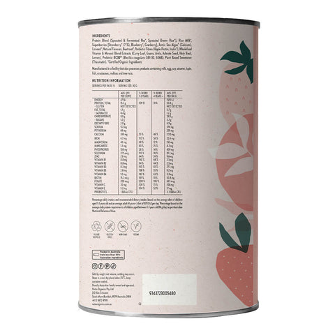 Protein Blend (Sprouted & Fermented Pea*, Sprouted Brown Rice*), Rice Milk* (18 %), Superberries [Strawberry* (7 %), Blueberry*, Cranberry], Arctic Sea Algae* (Calcium), Linseed*, Prebiotic Fibres (Apple Pectin, Inulin*), Natural Flavours, Beetroot*, Wholefood Vitamin & Mineral Extracts (Curry Leaf, Guava, Amla, Achiote Seed, Holy Basil, Lemon), Probiotic BC30® (Bacillus coagulans GBI-30, 6068), Natural Sweetener (Thaumatin). *Certified Organic Ingredients