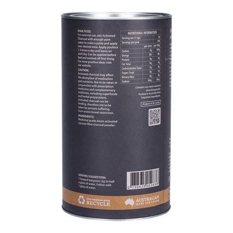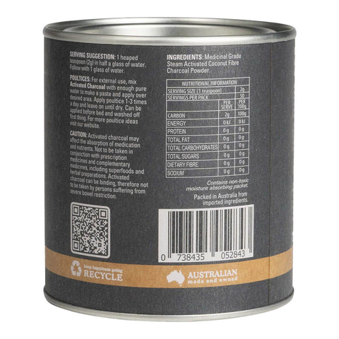 Activated Charcoal may affect the absorption of medication and nutrients. Not to be taken in conjunction with prescription medicines and complimentary medicines, including superfoods and herbal preparations. Activated charcoal can be binding, therefore not to be taken by persons suffering from severe bowel restriction.
