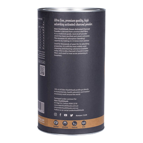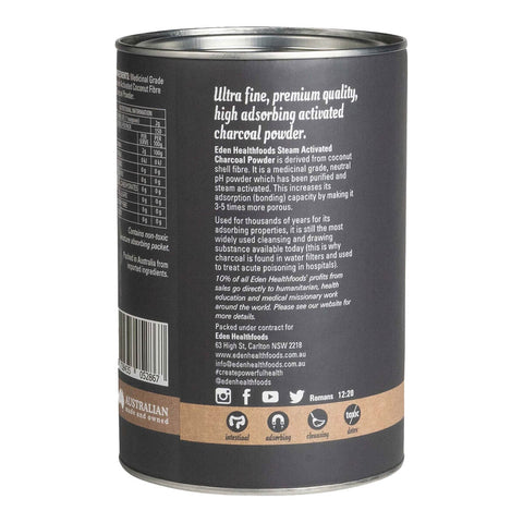 Eden Healthfoods Activated Charcoal Powder is an ultra-fine powder derived from pure coconut shell fibre. It has been steam activated (unlike chemical activation), making it 3-5 times more porous. It has also been medicinally activated using a purification process which empties the carbon molecules completely, further increasing its surface area, which enhances its adsorption and drawing capacity (more than steam activation alone).