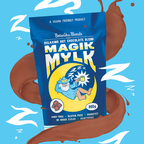 Botanika Blends Magik Mylk Hot Chocolate Blend is a decadent, delicious, rich, creamy hot chocolate blended with adaptogenic functional ingredients deigned to help you relax and unwind.