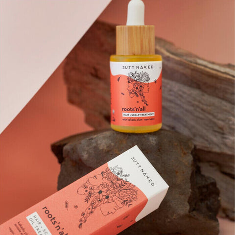The Butt Naked Body Roots n all Hair + Scalp Treatment Oil helps to promote healthy hair growth, add shine and eliminate dandruff. The vegan hair treatment aims to nourish the scalp, creating stronger and healthier hair that's soft to touch. Enriched with the highest sources of Vitamin E, Prickly Pear, Native Rosella Flower Oil and Kangaroo Oil, these nourishing ingredients will help restore and leave your strands silky smooth. Infused with powerful antioxidants to prevent the hair from breaking while also restoring the strands.