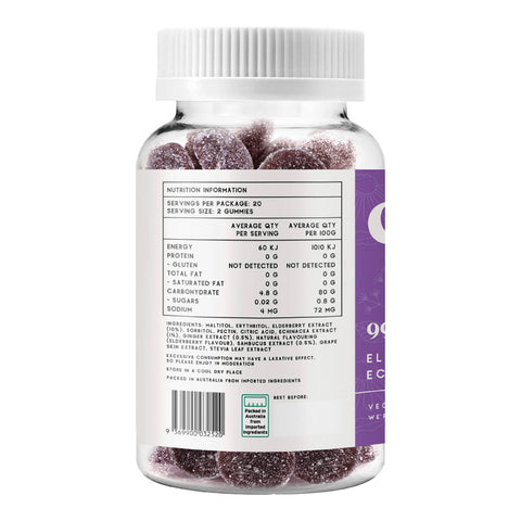 Maltitol, Erythritol, Elderberry Extract (10%), Sorbitol, Pectin, Citric Acid, Echinacea Extract (1%), Ginger Extract (0.5%), Natural Flavouring (Elderberry Flavour), Sambucus Extract (0.5%), Grape Skin Extract, Stevia Leaf Extract.
