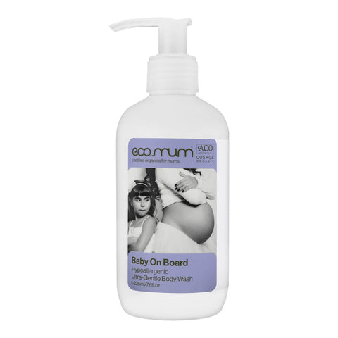 Eco.mum Baby On Board Hypoallergenic Ultra-Gentle Body Wash is crafted with certified organic, ultra-gentle amino acid and coconut-based cleansing technology, derived from 100% natural plant essences and nothing else.