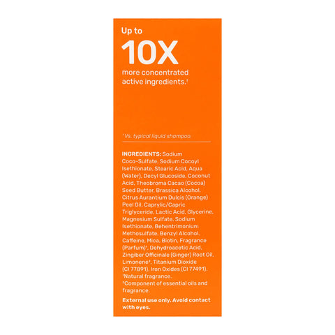 Sodium Coco-Sulfate, Sodium Cocoyl Isethionate, Stearic Acid, Aqua (Water), Decyl Glucoside, Coconut Acid, Theobroma Cacao (Cocoa) Seed Butter, Brassica Alcohol, Citrus Aurantium Dulcis (Orange) Peel Oil, Caprylic/Capric Triglyceride, Lactic Acid, Glycerine, Magnesium Sulfate, Sodium Isethionate, Behentrimonium Methosulfate, Benzyl Alcohol, Caffeine, Mica, Biotin, Fragrance (Parfum)¹, Dehydroacetic Acid, Zingiber Officinale (Ginger) Root Oil, Limonene², Titanium Dioxide (CI 77891), Iron Oxides (CI 77491).