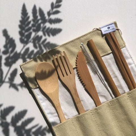It includes a knife, fork, spoon, chopsticks, bamboo straw and cleaning brush. It comes in a handy Green + Kind roll-up pouch in a natural beige colour with a press stud close. Packaged as is with a paper tag.