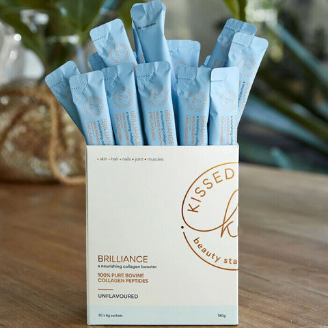 Developed by Rachael Finch in conjunction with leading food scientists, Kissed Earth Brilliance is easily absorbed and digested by the body and helps to combat visible signs of ageing, improve skin surface structure, and support bone and joint health. It also promotes stronger and healthier hair and nail growth, and is very beneficial for gut health.