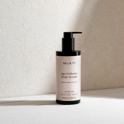 MUKTI Age Defiance Body Serum is a multi-active, antioxidant-rich treatment serum that delivers firming, brightening, and hydrating effects while strengthening the epidermal barrier and promoting cellular renewal for overall skin health.