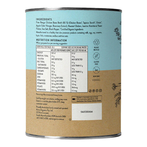 Free Range Chicken Bone Broth Powder* (Chicken Bones*, Filtered Water, Apple Cider Vinegar*, Himalayan Salt) (83 %), Roasted Chicken Powder (Roasted Chicken, Tapioca Starch, Ginger, Rosemary), Deactivated Savoury Flakes, Himalayan Crystal Salt, Black Pepper.