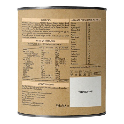 Hydrolysed Collagen Peptides, VERISOL® Bioactive Collagen Peptides, Natural Plant Based Flavours, Wildcrafted Sea Buckthorn Juice*, Maple Syrup (2%), Natural Sweetener (Monk Fruit extract), Bamboo Stem Extract, Vanilla Bean (0.5%), Orgen-Zn* Guava*, Pink Himalayan Crystal Salt.