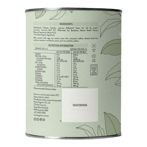 Hydrolysed Collagen Peptides, Japanese DÅMatcha Green Tea* (22%), lnulin*, Lucuma*, Coconut MCT Oil*, Wildcrafted Sea Buckthorn, Natural Vanilla Flavour, Natural Sweetener (Monkfruit).