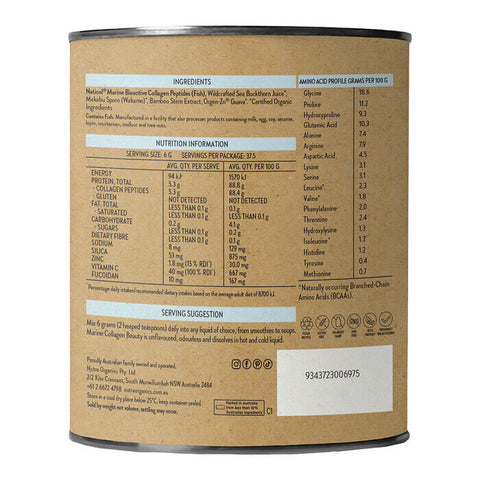 Naticol Marine Bioactive Collagen Peptides (Fish), Wildcrafted Sea Buckthorn Juice*, Mekabu Spore (Wakame)*, Bamboo Stem Extract, Guava Leaf Extract.