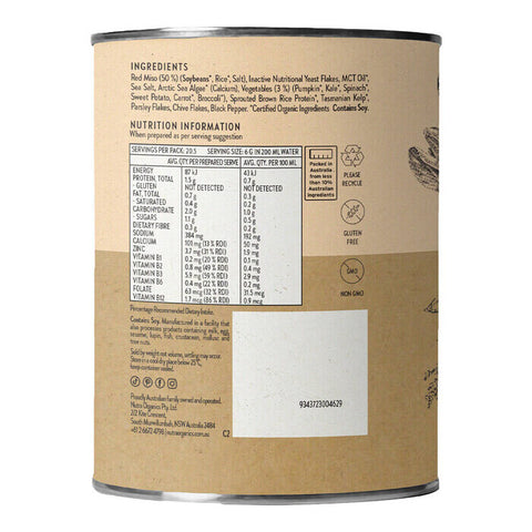 Red Miso* (51%) (Soybeans*, Rice*, Salt, Aspergillus Oryzae*), MCT Oil*, Deactivated Nutritional Savoury Flakes, Pink Himalayan Salt, Vegetables (6%) (Garlic, Onion, Pumpkin*, Kale*, Spinach*, Sweet Potato, Carrot*, Broccoli), Tapioca Starch*, Mirepoix (Onion, Carrot, Celery, Salt, Garlic, Pepper), Aquamin Marine Minerals* (Arctic Sea Algae*), Brown Rice Protein*, Turmeric*, Tasmanian Kelp, Parsley, Chives, Black Pepper.