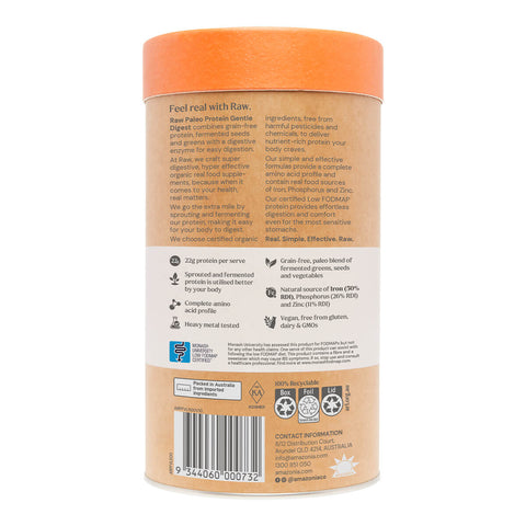 Amazonia Raw Protein Gentle Digest - Vanilla is a low FODMAP certified, delicious paleo-friendly blend that combines sprouted plant protein with fermented greens, seeds and vegetables.