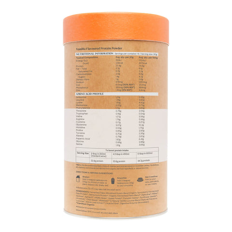 Fermented Paleo Wholefood Protein Blend [Organic Sprouted & Fermented Pea Protein*, Sacha Inchi Protein*, Organic Fermented Paleo Blend* (Spirulina*, Millet*, Quinoa*, Spinach*, Alfalfa Grass*, Sweet Potato*, Pumpkin Seeds*, Sunflower Seeds*, Linseeds*, Chia Seeds*, Molasses*#)], Natural Vanilla Lucuma Blend (Natural Flavours, Lucuma*, Stevia Leaf Extract*), Acacia Fibre*, Digestive Enzyme (Bromelain).