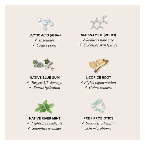 Aloe barbadensis (Aloe Vera) Leaf Juice, Heptyl Glucoside (Plant-derived), Vaccinium myrtillus (Bilberry) Fruit Extract, Saccharum officinarum (Sugar Cane) Extract, Citrus aurantium dulcis (Orange) Fruit Extract, Citrus limon (Lemon) Fruit Extract, Acer saccharum (Sugar Maple) Extract, Glycerin (Plant-derived), Lactic Acid, Niacinamide (Vit B3), Eucalyptus globulus (Tasmanian Blue Gum) Leaf Extract, Mentha australis (River Mint) Leaf Extract, Glycyrrhiza glabra (Licorice) Root Extract, Alpha-Glucan Oligosaccharide (Prebiotic), Polymnia Sonchifolia (Yacon) Root Juice, Lactobacillus (Probiotic), Citrus bergamia (Bergamot) Fruit Oil, Citrus nobilis (Mandarin) Peel Oil, Citrus paradisi (Grapefruit) Fruit Oil, Rosa damascena (Rose) Oil, Citrus sinensis (Sweet Orange) Fruit Oil, Gardenia Florida (Blue Gardenia) Fruit Extract, Sodium Benzoate, Benzyl Alcohol, Citric Acid, Potassium Sorbate, Dehydroacetic Acid. Naturally occurring in essential oils: Citral, d-Limonene, Linalool, Geraniol, Citronellol.