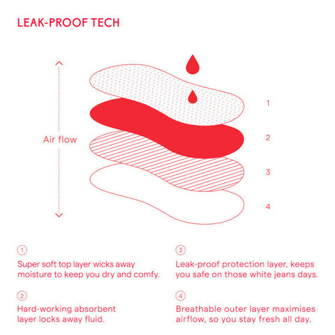 Wear like your favourite underwear. Don't panic, they're leak-free! After use, rinse in cold water until it runs clear. Machine wash cold with mild detergent, do not bleach. Hang or tumble dry on low.