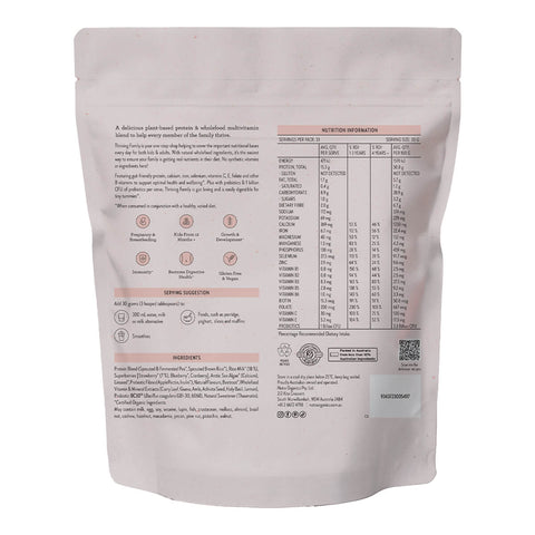 Thriving Family delivers a wholesome boost of protein, calcium, iron, selenium, vitamins C, D, E, folate and other B vitamins, all from organic wholefoods to support optimal health and wellbeing.