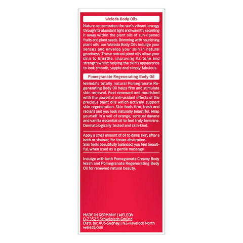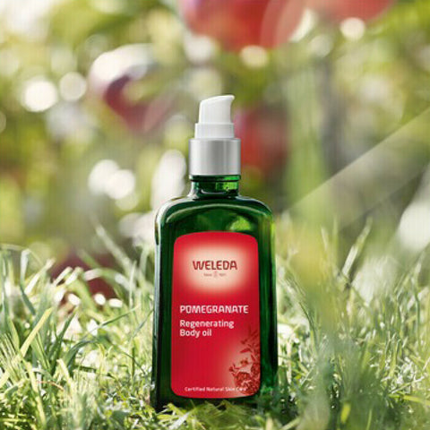 Help to accelerate the process of natural skin cell renewal with this Pomegranate Regenerating Body Oil from Weleda. It uses a beautiful combination of Organic Pomegranate with the rejuvenating oils of Jojoba, Sesame and Macadamia as well as a sweet, fruity blend of orange and vanilla. Rich in skin loving nutrients, it helps to boost regeneration, smooth and hydrate. Weleda test results show 50% increased cell renewal after 14 days and 13% increased skin firmness after 28 days*